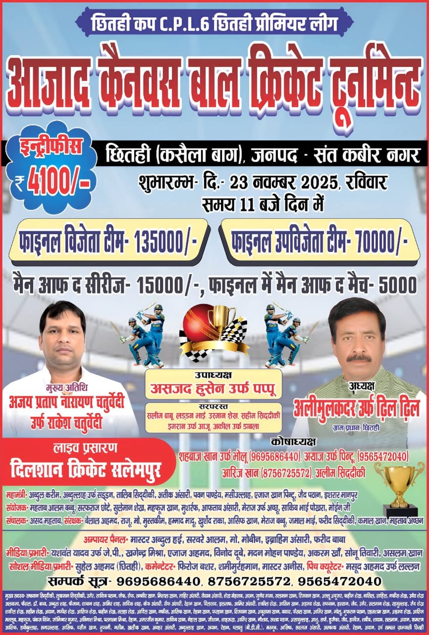 जिले के दक्षिणांचल में स्थित छितही की सरजमीं एक बार फिर क्रिकेट का जुनून, रोमांच और कैनवस बाल के सितारों के हैरतंगेज जंग प्रदर्शन का साक्षी बनेगी। कैनवास बाल के बिहार और उत्तर प्रदेश के सितारों सहित आईपीएल के स्टार खिलाड़ियों के इस प्रतियोगिता में शिरकत करने की संभावना है। 23 नवंबर से आयोजित होने वाली इस सबसे बडी ईनामी क्रिकेट प्रतियोगिता का भव्य शुभारंभ बस्ती संतकबीरनगर के युवाओं में सर्वाधिक लोकप्रिय व्यक्तित्व नाथनगर के पूर्व ब्लॉक प्रमुख एवम् एसआर ग्रुप के चेयरमैन राकेश चतुर्वेदी करेंगे। उक्त जानकारी प्रतियोगिता के संरक्षक असजद हुसैन उर्फ पप्पू ने दी है। उन्होंने बताया कि इस प्रतियोगिता को भव्य बनाने के लिए कमेटी के सभी जिम्मेदार लगातार अपनी जिम्मेदारियां निभाने में जुटे हुए है। प्रतियोगिता के अध्यक्ष अलीमुलकदर उर्फ ढिलढिल प्रधान की निगहबानी में पिच से लेकर मैदान को और बेहतर बनाने और संवारने की तैयारियां अंतिम दौर में है। श्री हुसैन ने बताया कि इस प्रतियोगिता में कैनवस बाल के राष्ट्रीय स्तर के तमाम चर्चित खिलाड़ियों के खेलने की उम्मीद है। प्रतियोगिता का उद्घाटन नाथनगर ब्लॉक के पूर्व ब्लॉक प्रमुख एवम् एसआर ग्रुप के चेयरमैन राकेश चतुर्वेदी करेंगे। आयोजन समिति ने प्रतियोगिता के उद्घाटनकर्ता युवाओं के प्रेरणाश्रोत पूर्व प्रमुख राकेश चतुर्वेदी के भव्य स्वकत की तैयारियां शुरू कर दिया है। पिछले साल भी समूची प्रतियोगिता राकेश चतुर्वेदी के व्यक्तित्व के साए में संपन्न हुई थी। युवा समाजसेवी असजद हुसैन उर्फ पप्पू ने कहा कि उद्घाटन समारोह को यादगार बनाने की तैयारियां लगभग पूरी हो गई हैं। उन्होंने बताया कि सीपीएल 6 सीजन की विजेता बनने वाली टीम को 1 लाख 35 हजार रुपए, उप विजेता टीम को 70 हजार रुपए के नगद पुरस्कार के साथ ही चमचमाती हुई ट्राफी प्रदान की जाएगी। इस प्रतियोगिता की इंट्री फीस 4हजार रुपए निर्धारित की गई है। मैन ऑफ द टूर्नामेंट को 15 हजार रुपए और फाइनल के मैन ऑफ द मैच को 5 हजार का नगद पुरस्कार दिया जाएगा।