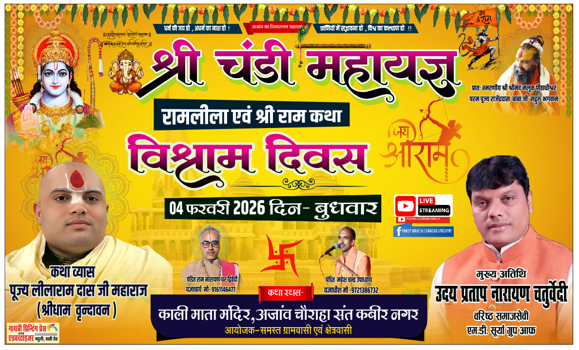 नाथनगर ब्लॉक क्षेत्र के ग्राम अजांव में बीते 27 जनवरी से श्रीचंडी महायज्ञ में श्रीराम कथा और रामलीला का चल रहा मनमोहक मंचन श्रीचंडी महायध्य के समापन पर आयोजित आरती में हिस्सा लेंगे डा उदय प्रताप चतुर्वेदी
