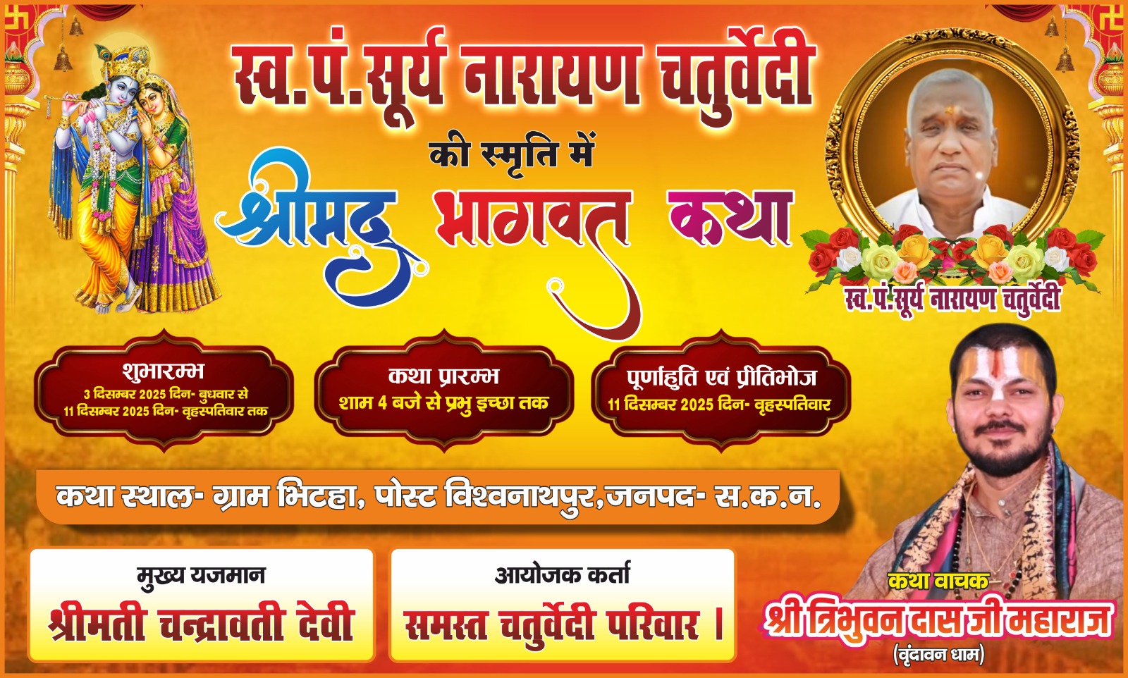 स्व पंडित सूर्य नारायण चतुर्वेदी की स्मृति में आयोजित होगी श्रीमद् भागवत कथा