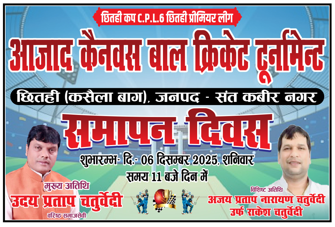 जिले के सबसे बड़े इनामी क्रिकेट प्रतियोगिता छितही प्रीमियर लीग के 6ठवे संस्करण का शनिवार को भव्य समापन होगा। कबीर की सरजमीं पर समाजसेवा की इबारत लिखने वाले सूर्या ग्रुप के चेयरमैन डा उदय प्रताप चतुर्वेदी इस प्रतियोगिता के समापन समारोह के मुख्य अतिथि होंगे। मानपुर के ग्राम प्रधान प्रतिनिधि शमशाद अहमद गामा द्वारा प्रयोजित टीम गामा – दिलशाद स्पोटिंग और आजमगढ़ की टीमों के बीच होने वाले फाइनल मैच का विजेता सीपीएल 6 कप का हीरो बनेगा। ऐतिहासिक सीपीएल 6 के समापन समारोह के चीफ गेस्ट डा उदय प्रताप चतुर्वेदी के ऐतिहासिक इस्तकबाल की तैयारियों में समूची कमेटी लगी हुई है। प्रतियोगिता की आयोजन कमेटी के अध्यक्ष ग्राम प्रधान अलीमुल कदर उर्फ ढिलढिल प्रधान और उपाध्यक्ष असजद हुसैन उर्फ पप्पू भैया ने संयुक्त रूप से बताया कि चीफ गेस्ट डा उदय प्रताप चतुर्वेदी के ऐतिहासिक स्वागत की सारी तैयारियां पूरी कर ली गई हैं। प्रधान प्रतिनिधि सलीम बाबू के नेतृत्व में सैकड़ों बाइक सवार युवक मुख्य अतिथि को महुली से रिसीव करके उनका पारंपरिक स्वागत करेंगे। अपने अनुज पूर्व ब्लॉक प्रमुख राकेश चतुर्वेदी द्वारा शुभारंभ किए गए भव्य खेल महाकुंभ का ऐतिहासिक समापन डा उदय प्रताप चतुर्वेदी करेंगे।