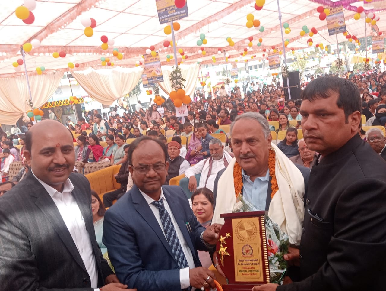जनपद के प्रतिष्ठित शैक्षणिक संस्थान सूर्या सीनियर सेकेंड्री स्कूल खलीलाबाद का 13वा वार्षिकोत्सव समारोह बुधवार को धूमधाम से संपन्न हुआ। भारतीय संस्कृति और सभ्यता को उकेरती नौनिहालों की शानदार सांस्कृतिक प्रस्तुतियों ने मौजूद अतिथियों और अभिभावकों को मंत्र मुग्ध कर दिया। समारोह को संबोधित करते हुए चीफ गेस्ट जिले के मुख्य विकास अधिकारी जयकेश त्रिपाठी ने कहा कि आज के नौनिहालों को समय के सदुपयोग और परिवार के साथ ही समाज में संवाद का माहौल बनाने को प्रेरित करने की जरूरत है। उन्होंने स्पष्ट किया कि आज की पीढ़ी को शिक्षा के साथ ही जीवन जीने की शैली से भी परिपूर्ण करना होगा।उन्होंने कहा कि आज छात्रों को दिशा देने की जरूरत है। नौकरी हासिल कर लेना और पैसा कमाना ही जीवन में पर्याप्त नहीं है। नाम और पैसा होते हुए भी यदि व्यक्ति सामाजिकता और परिवार से परे हो जाता है तब भी उसका पतन हो सकता है।इसलिए हर परिस्थिती से निपटने और उससे विचलित न होने की सीख जरूरी है। उन्होंने सूर्या के नौनिहालों की प्रस्तुतियों को अद्भुत और अलौकिक बताते हुए उनके उज्ज्वल भविष्य की कामना किया। विशिष्ट अतिथि गोरखपुर विश्वविद्यालय की प्रोफेसर जितेंद्र मिश्र ने कहा कि अभिभावक अपने पाल्यों का भाग्य विधाता बनने की जिद छोड़ दें अपना कैरियर चुनने का अवसर खुले मन से दें,बस उन्हें सही मार्गदर्शन और सहयोग देते रहें। उन्होंने कहा कि बच्चों पर अपनी मर्जी थोपने से वे दबाव महसूस करेंगे। जिसका परिणाम होगा कि वे अपनी बात आपके समक्ष रखने में भी संकोच करेंगे।उन्होंने सूर्या इंटरनेशनल स्कूल के छात्र छात्राओं की प्रस्तुति को सराहनीय बताया। विशिष्ट अतिथि प्रो ओपी पांडेय ने वार्षिकोत्सव पर छात्र छात्राओं की प्रस्तुति को अनुकरणीय बताया। उन्होंने कहा कि छात्रों का परफारमेंस बेहद शानदार रहा।उन्होंने सूर्या संस्थान को रोजगार परक शिक्षा देने का हब बताया। प्रो पांडेय ने कहा कि सूर्या संस्थान सिर्फ बेस्ट परफॉर्मर्स ही नही बल्कि देश के लिए एक संस्कारित नागरिक का भी निर्माण कर रहा है। संस्थान के चेयरमैन डा उदय प्रताप चतुर्वेदी ने आए हुए अतिथियों और अभिभावकों का आभार प्रकट किया। डा चतुर्वेदी ने अभिभावकों को भरोसा दिलाया कि सूर्या ग्रुप उनके नौनिहालों के बचपन को संवारने के साथ ही उनके कैरियर को निखारने के प्रति भी संकल्पित है। समारोह में अतिथियों का माल्यार्पण कर उन्हें शाल और बुकें भेंट कर सम्मानित किया गया। एक्जीक्यूटिव डायरेक्टर सविता चतुर्वेदी ने संस्थान को नित नई ऊंचाईयों पर ले जाने का संकल्प दोहराते हुए अतिथियों के प्रति आभार जताया। प्रधानाचार्य रविनेश श्रीवास्तव ने अपने संबोधन में विद्यालय की स्थापन